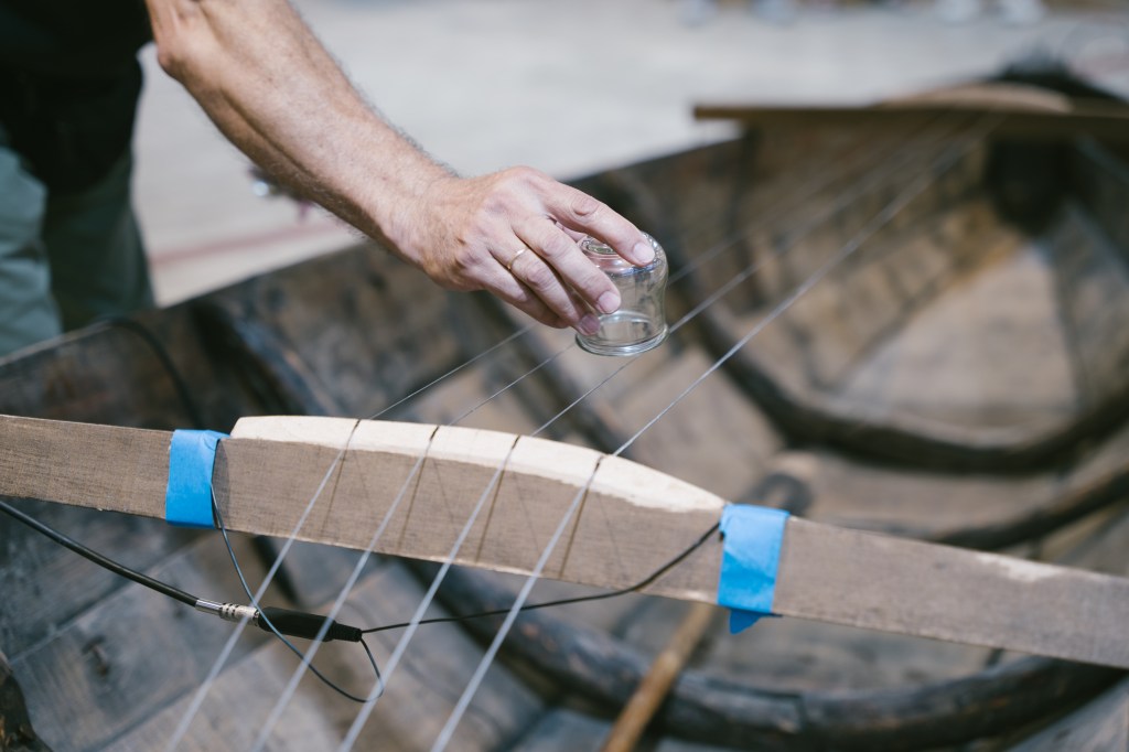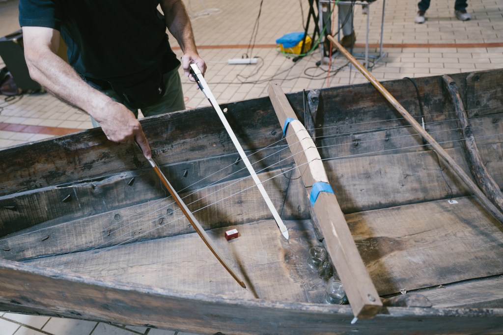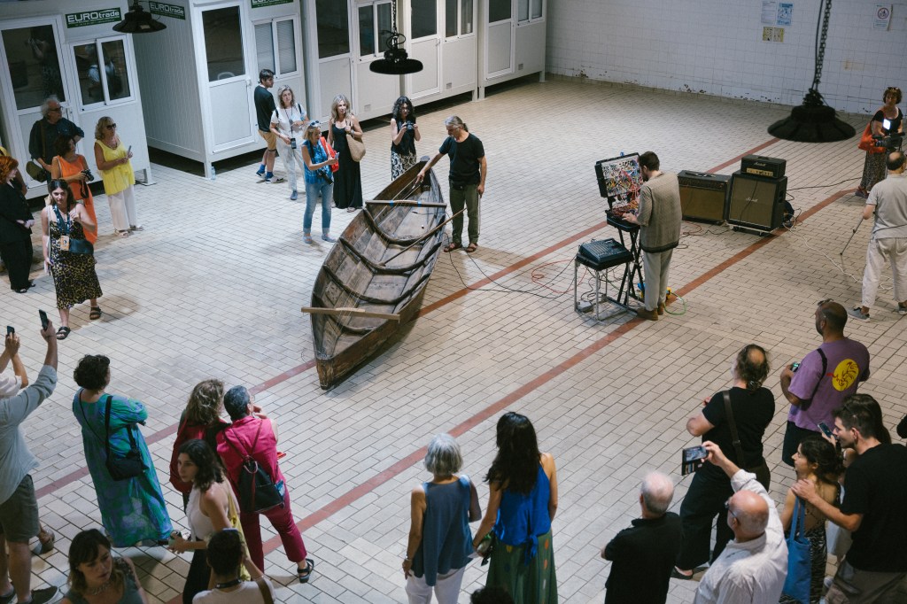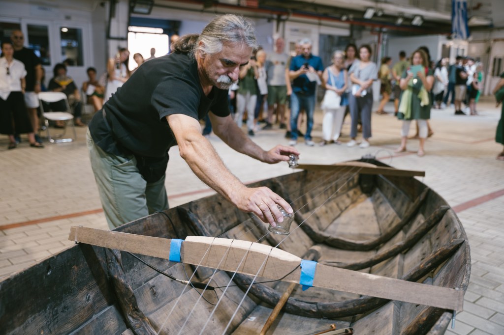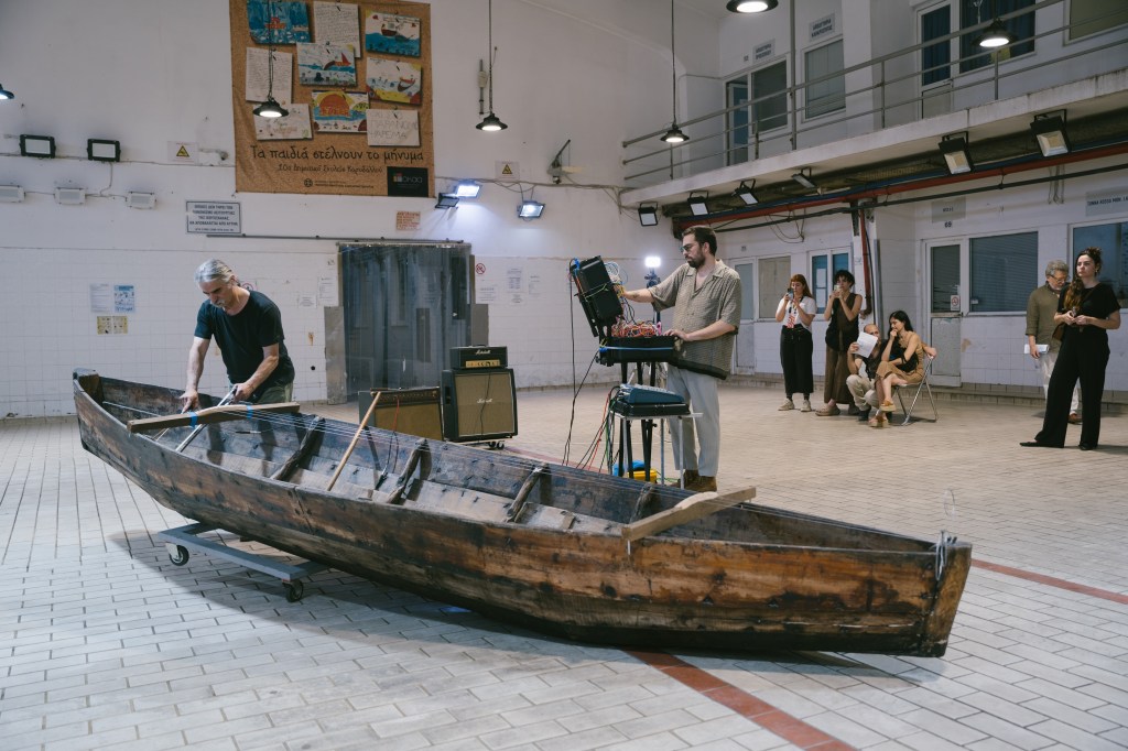 At 8 pm AMVRAKIA.BLUES: Artist Panos Charalambous and his collaborator guitarist/singer/multi-instrumentalist/producer Angelos Krallis transform a fishing boat made from Pinus heldreichii from Lake Amvrakia – used in shallow lagoons – into a unique musical instrument. AMVRAKIA.BLUES is an exploration of ancestral origins, a fusion of artistic and ethno-acoustic endeavors to listen to one’s birthplace. The barcarole incorporates sounds linked to fishing and activities conducted on the boat, informed by the avant-garde and modernity. At the same time, their sound performance will create a conversation among all water bodies, symbolizing the interconnectedness of aquatic ecosystems. This performance underscores the fluidity and porousness of water. Courtesy of the artist and CITRONNE Gallery.