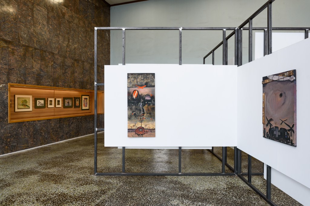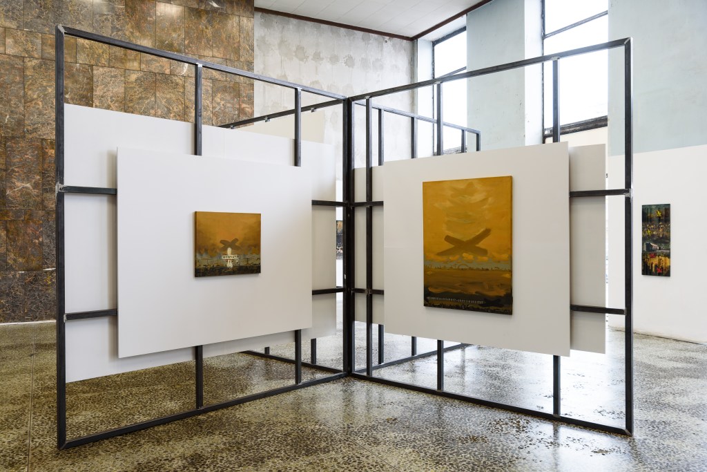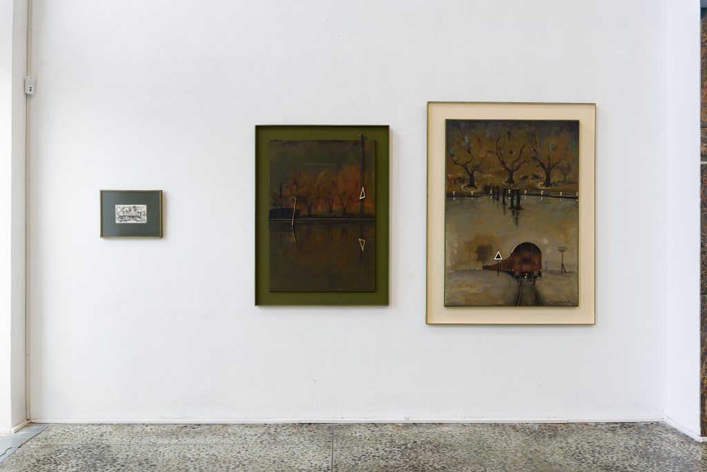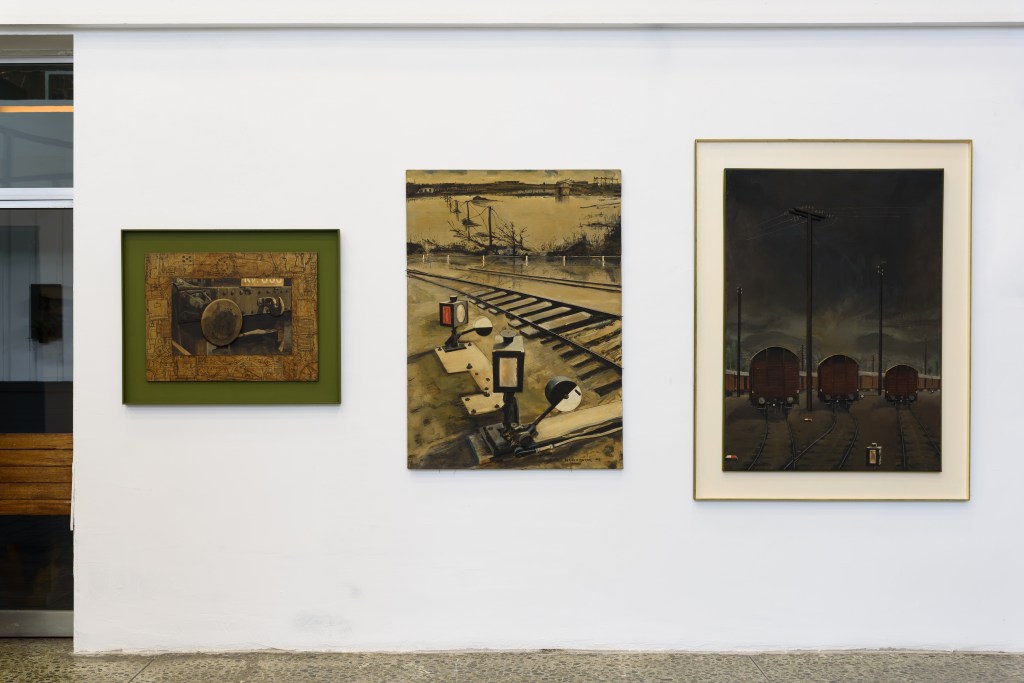 “Many paintings are made with a combination of attached and collaged elements that occasionally deceive the eye: photocopies of trains sit next to painted ones, while a telegraph pole made of wood mirrors another painted in a way that makes it appear affixed to the canvas.”
