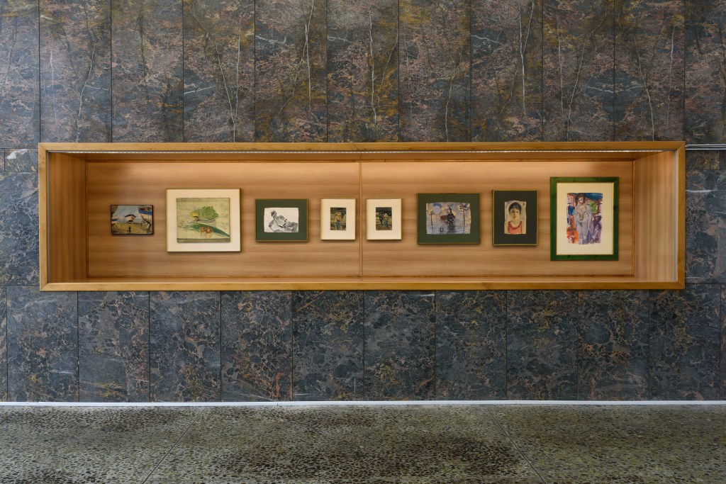 The vitrines offer additional context, revealing the breadth of Mavromatis’s practice. According to art historian Periklis Sfyridis, his career, beginning in 1956, includes still lifes, portraits, nudes, musicians, and works with folk or religious motifs, often in distinctive colors like oil greens and purples. These are complemented by maritime scenes, boats, shipyards, and general port life. Two early works with human figures—rare depictions of railway workers—stand out. The display also includes smaller works from the Erotica (1982–1991) and Egypt (1995–1997) series, demonstrating the scope of his experimentation alongside the larger works at the exhibition’s center.