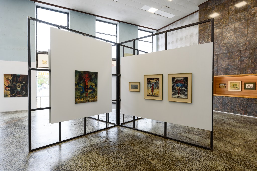 The later period, from 1982 onward, is marked by freedom in drawing, a broader color range (reds, blues, turquoise), and increased emotional intensity, evident in works from 1990–1997. These pieces often organize the painted surface into zones emphasizing the light–dark duality, with realistic elements below and symbolic or abstract motifs above (numbers, letters, calligraphy). One work from his final series, Ancient Agora, combines multiple layers and motifs: monuments, urban and symbolic landscapes, and trains rendered with stark contrasts of light and dark.