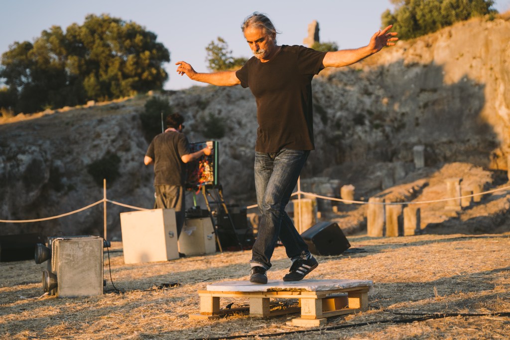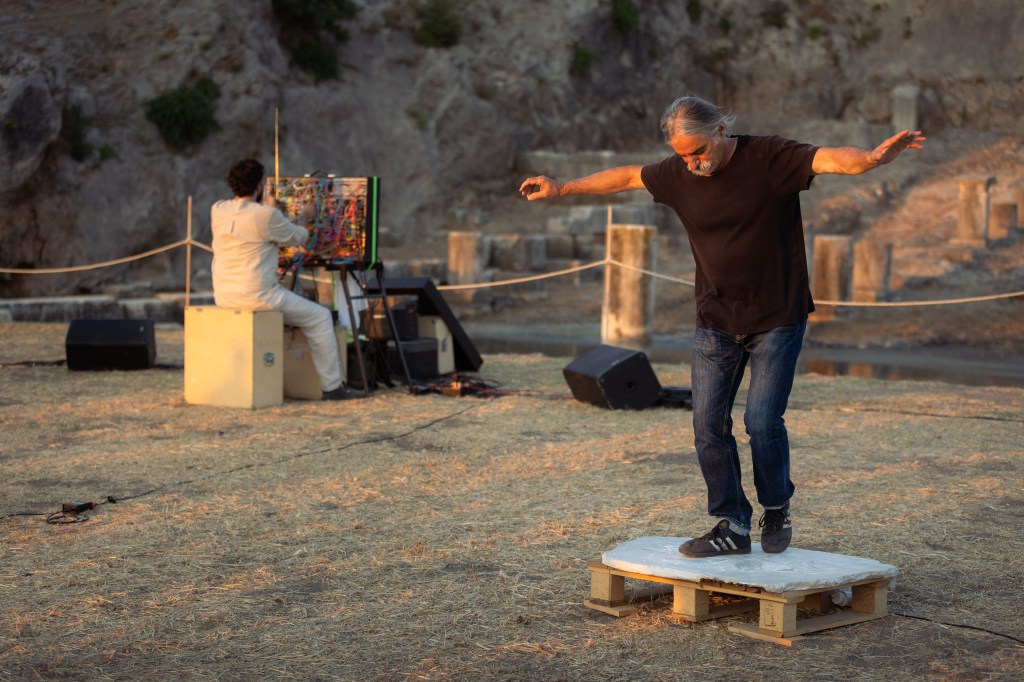 A boat from Lake Amvrakia—an emblem of subsistence from Charalambous’ rural home—becomes a musical instrument, carrying the intertwined stories of local life and ecological entanglement. This gesture weaves personal memory with collective struggle over land and water, prompting reflection on who controls these vital resources. Charalambous dances a deconstructed tsamiko—a traditional dance—stretched and elongated on marble surfaces.